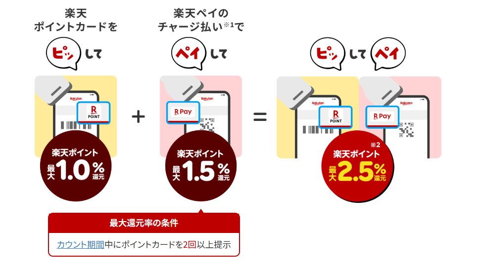 楽天ペイは、楽天ポイント加盟店で利用したり、チャージ払いをしたりなど、条件達成で最大2.5%のポイント還元されます。