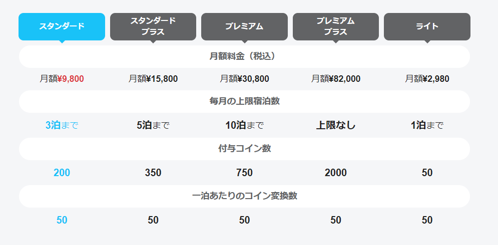 HafHは月額9,800円で300コインもらえるので、200コインの宿泊なら100コイン余って翌月に繰り越すこともできます。