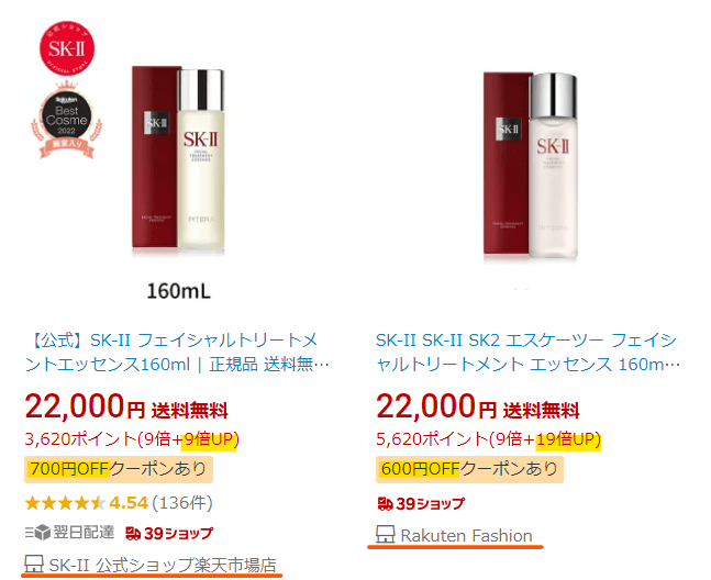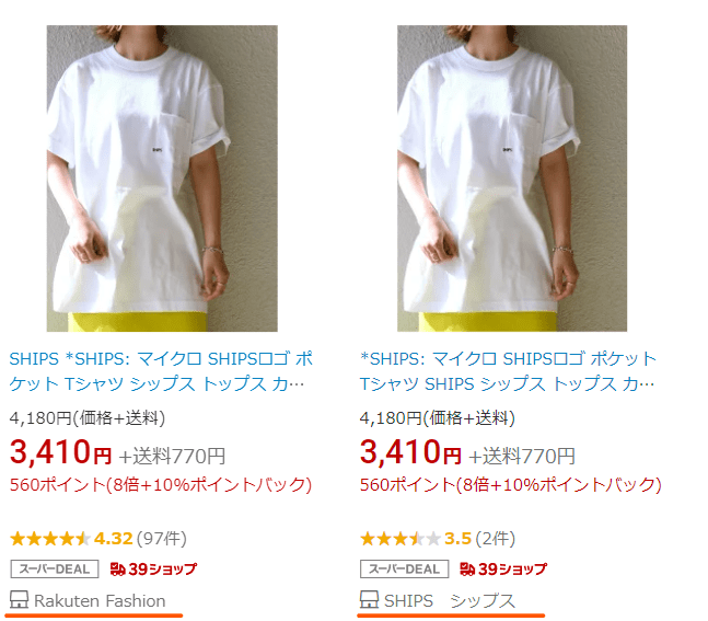 表示価格は同じですが、使えるクーポンやポイント還元の有無で実質の価格は異なります。