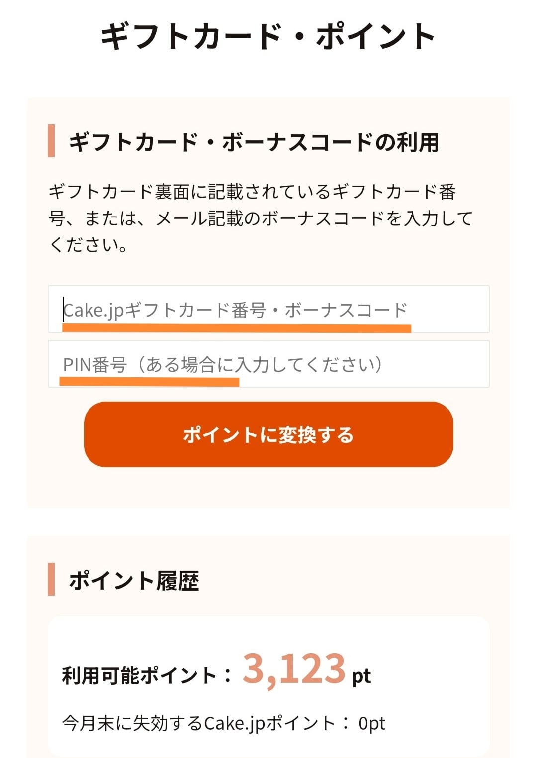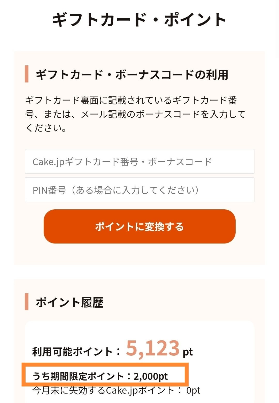 Cake.jpギフトカードは、期間限定ポイントとしてポイント残高に加算されます。