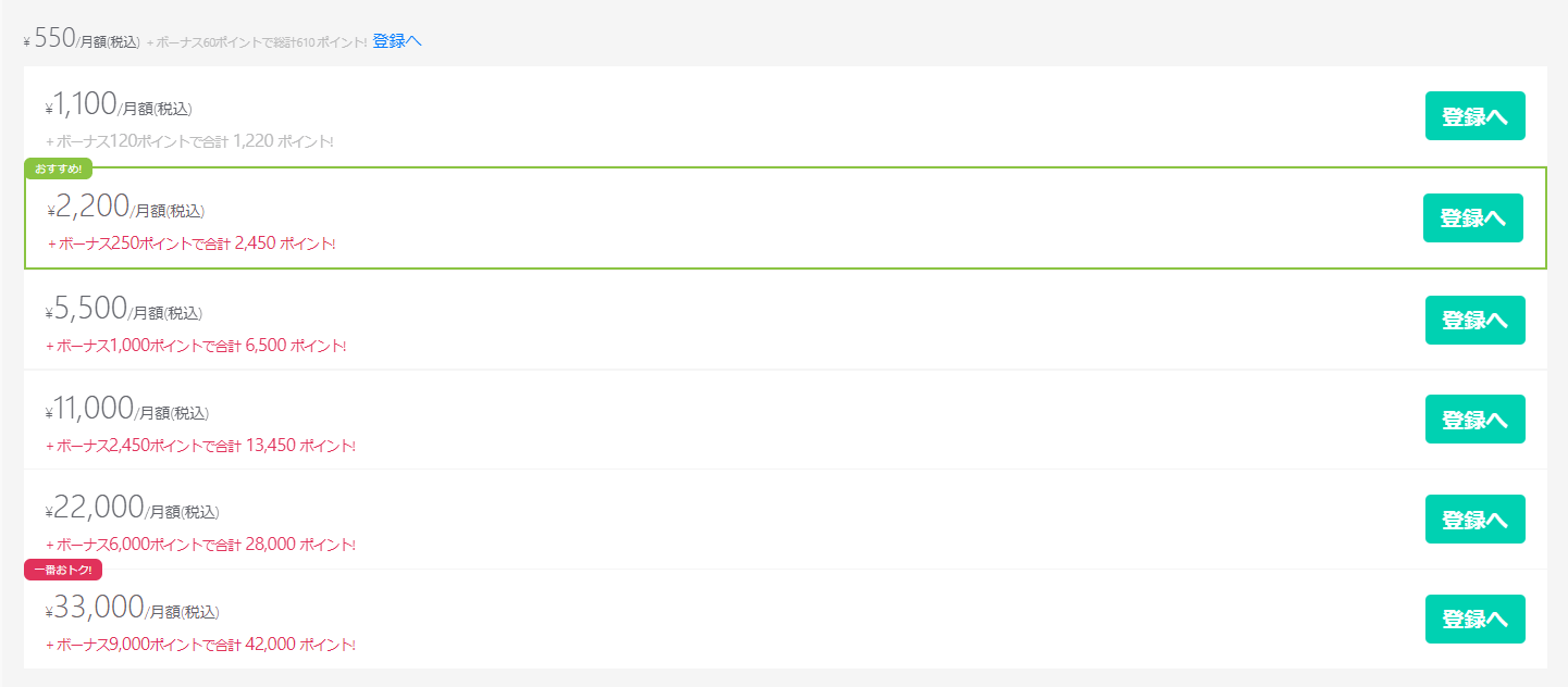 たとえば、月2,200円のプランを選ぶと、ボーナスポイントも合わせて2,450円分のポイントがもらえます。