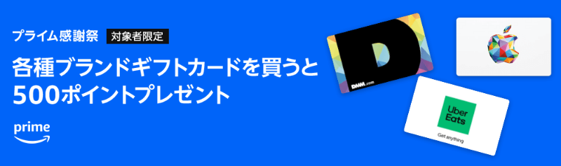 Amazonで対象のギフトカードを購入すると500ポイントプレゼントキャンペーンを実施しています。