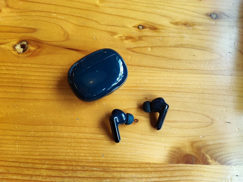 イヤホン本体はシンプルなデザイン。ケースと同様、光沢がある質感です。