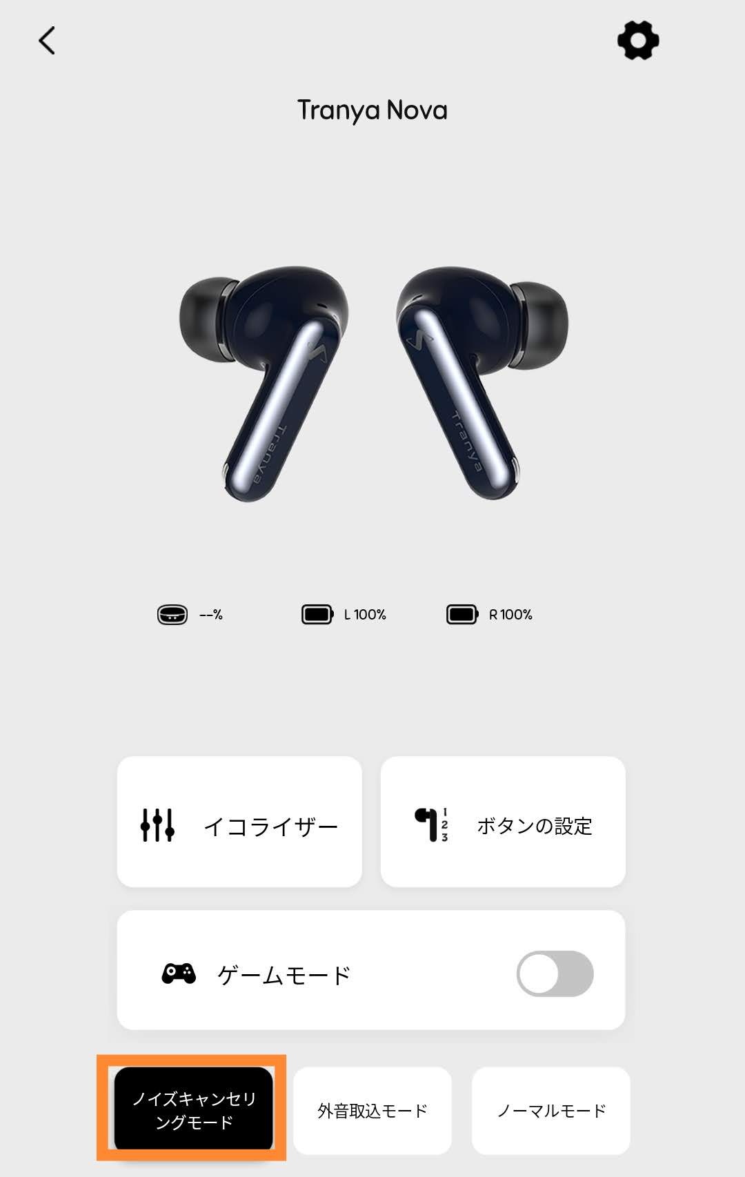 イヤホン本体のタッチ操作でも変更できますが、ノイズキャンセリング/外音取込/ノーマルモードをアプリから設定することも可能です。