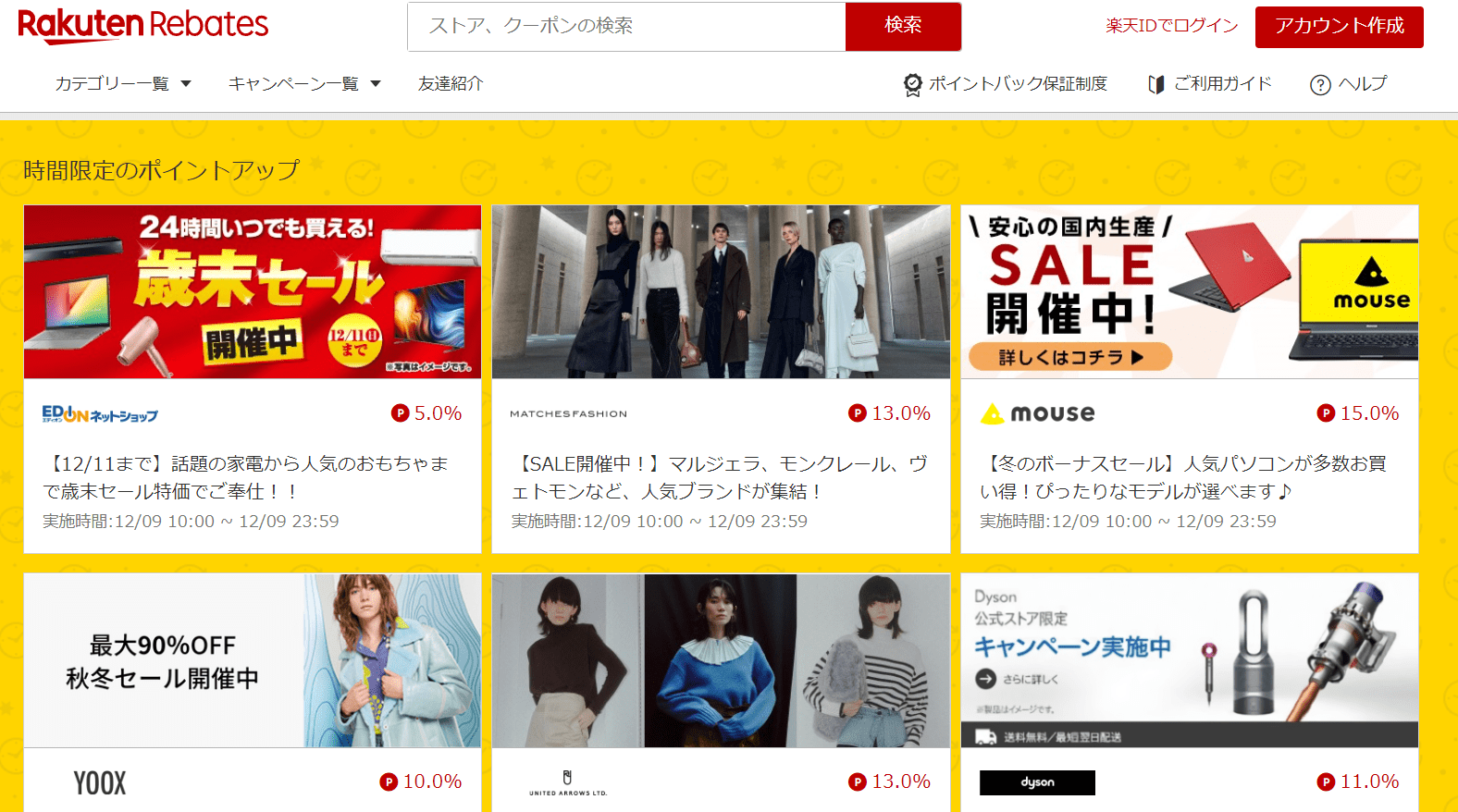 楽天リーベイツは楽天スーパーセール開催中(3・6・9・12月)が特にお得なタイミングで、数多くのショップが還元率がアップします。