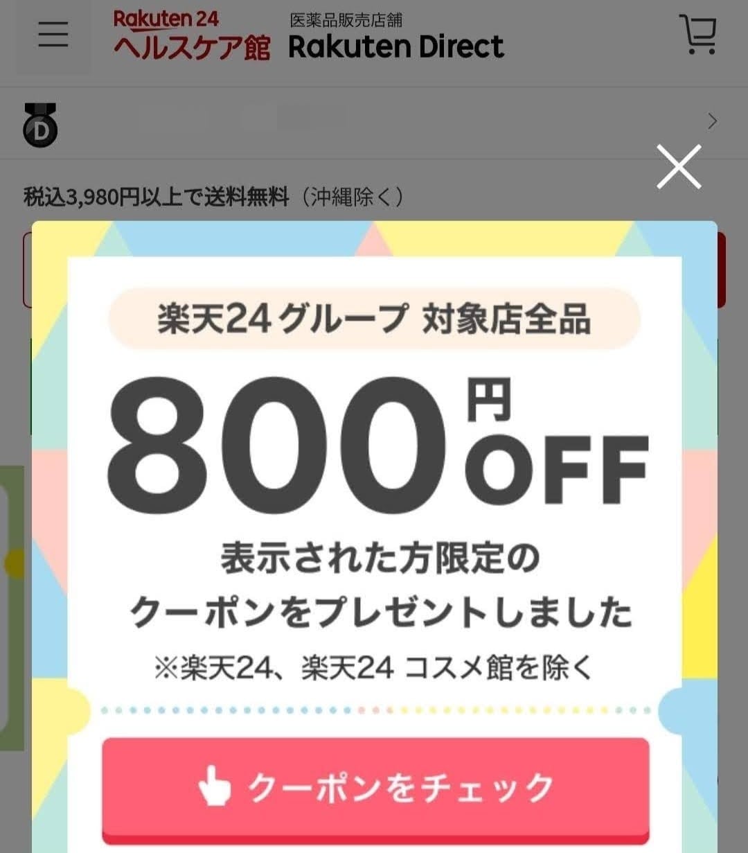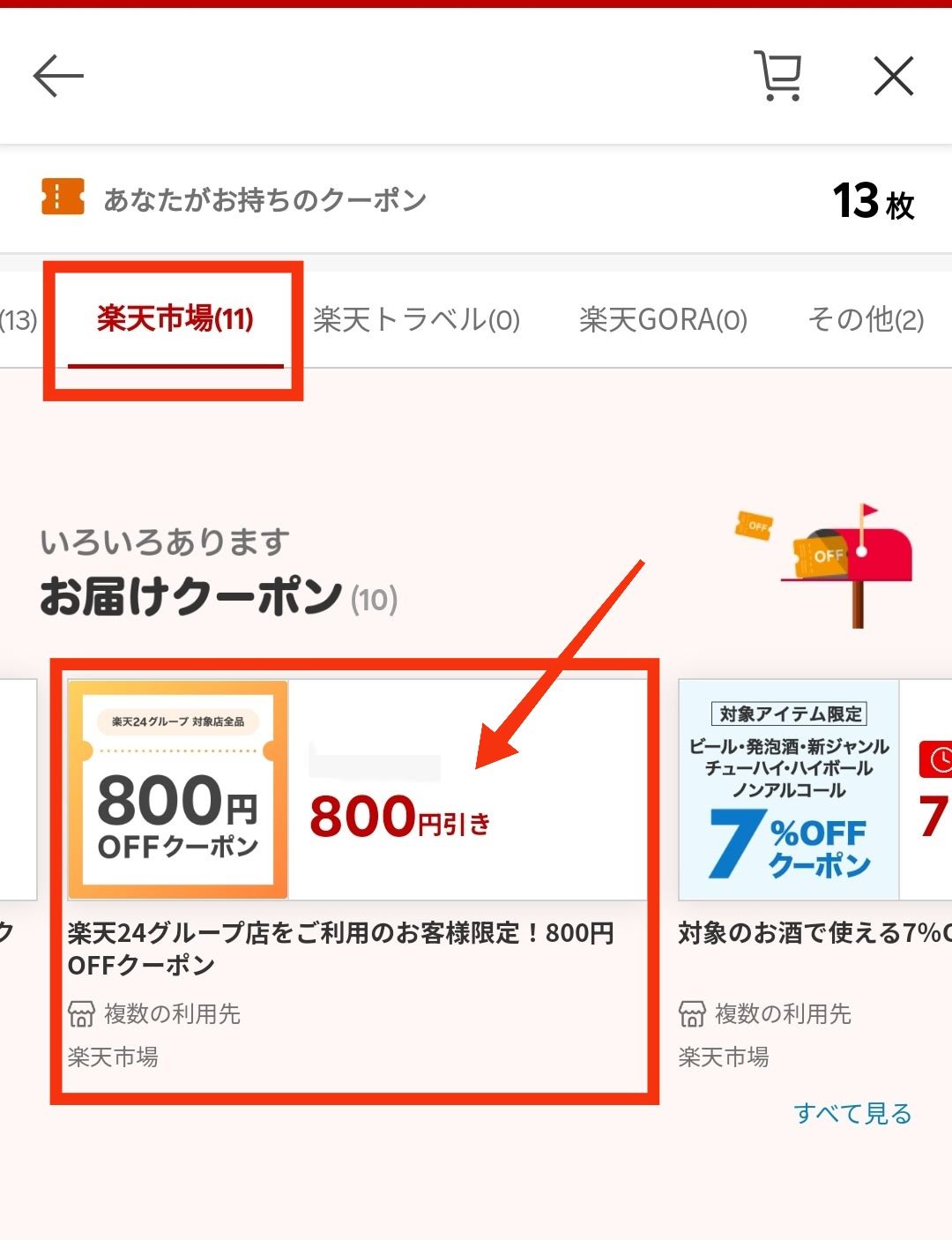 楽天24グループで500円、800円クーポンが対象者限定で配布されています。
