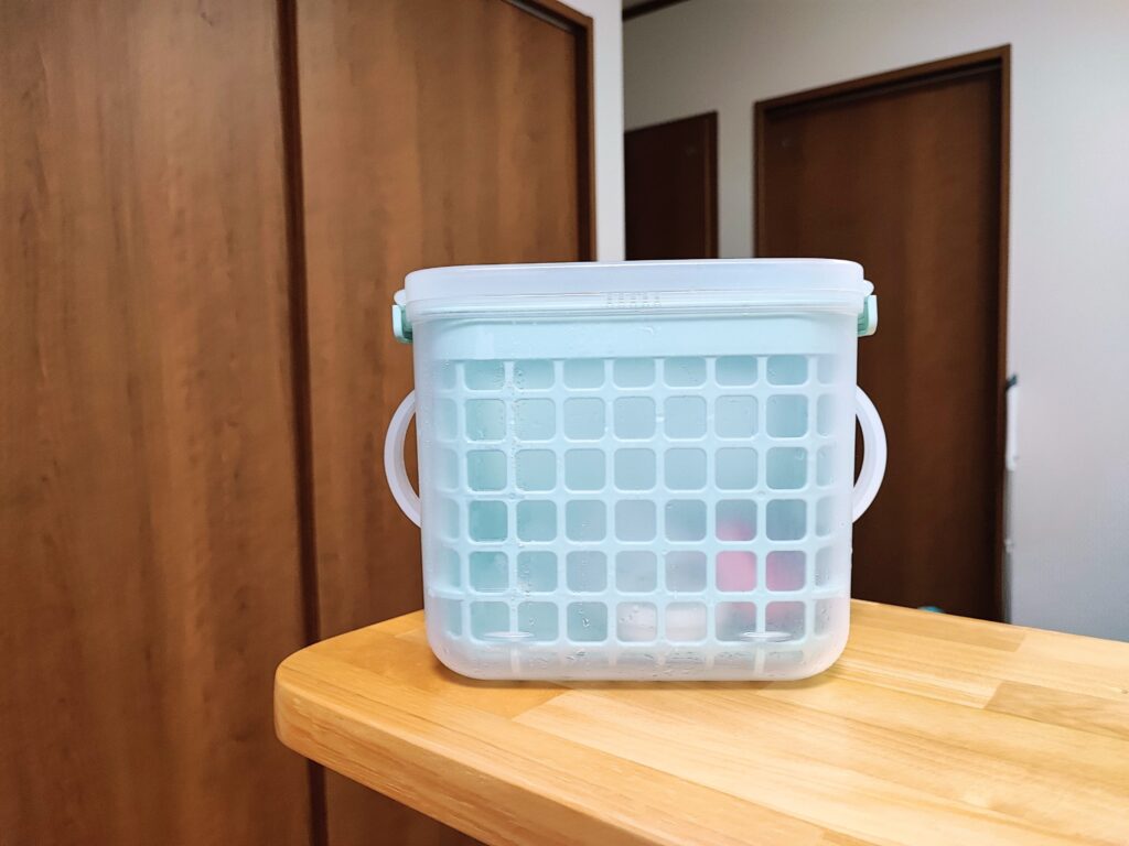 ケースは半分メッシュ構造になっているため、メッシュ部分を上にしてレンジに入れ、水を入れます