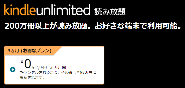 過去にKindle Unlimitedを登録・利用をした事のないプライム会員(無料期間含む)の方は、2ヵ月無料などのキャンペーンか、Prime Readingを利用できます。