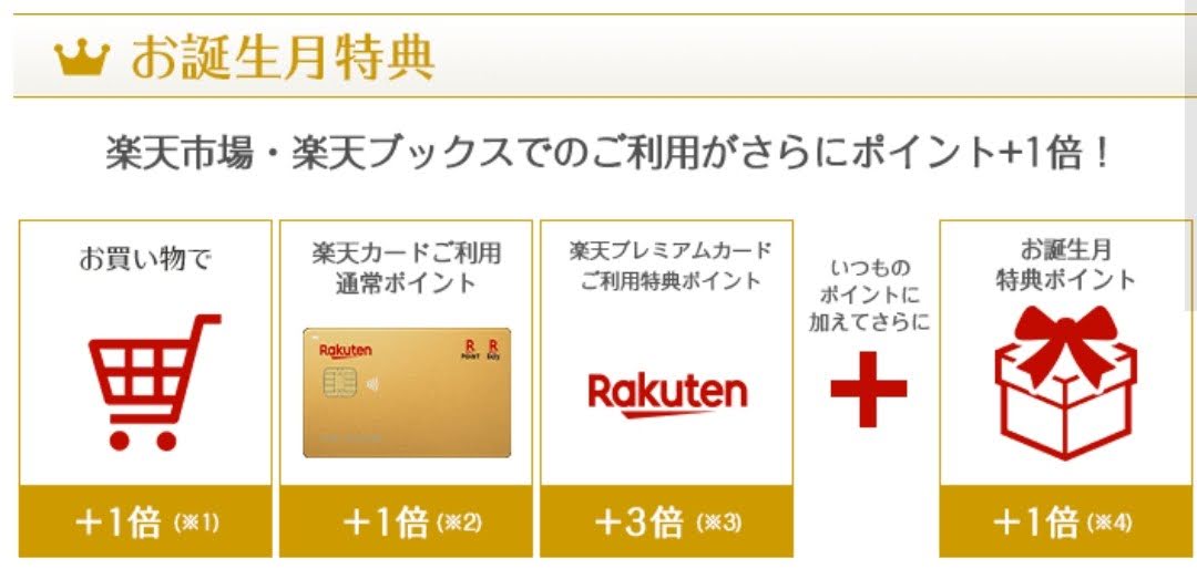 誕生月には楽天市場・楽天ブックスの利用がさらにポイント1倍となる特典です。