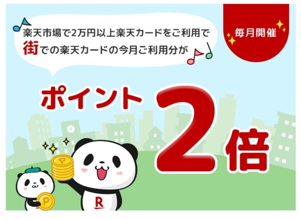 楽天カードが毎月開催されているキャンペーンに「楽天市場で2万円以上利用で街のポイントが2倍」というものがあります。※現在終了