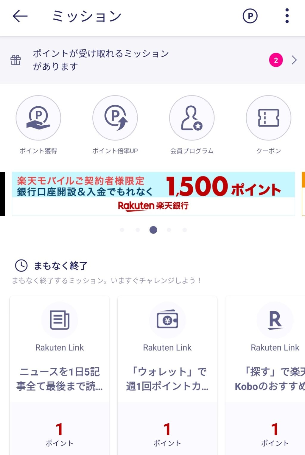 アプリを開いて設定fa-barsから「ミッション」をタップし、条件をクリアさせるとポイントがもらえます。