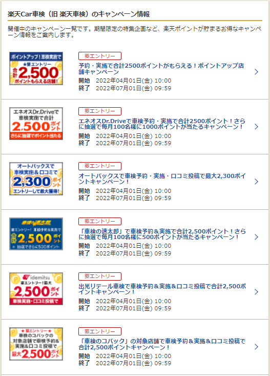 随時開催されているキャンペーンにエントリーし、車検を予約・実施するとポイントをもらうことができます。