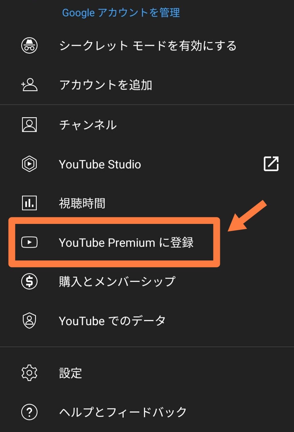 YouTubeアプリを起動して、右上のアカウントアイコンをタップし、メニュー内の「YouTube Premiumに登録」をタップします。