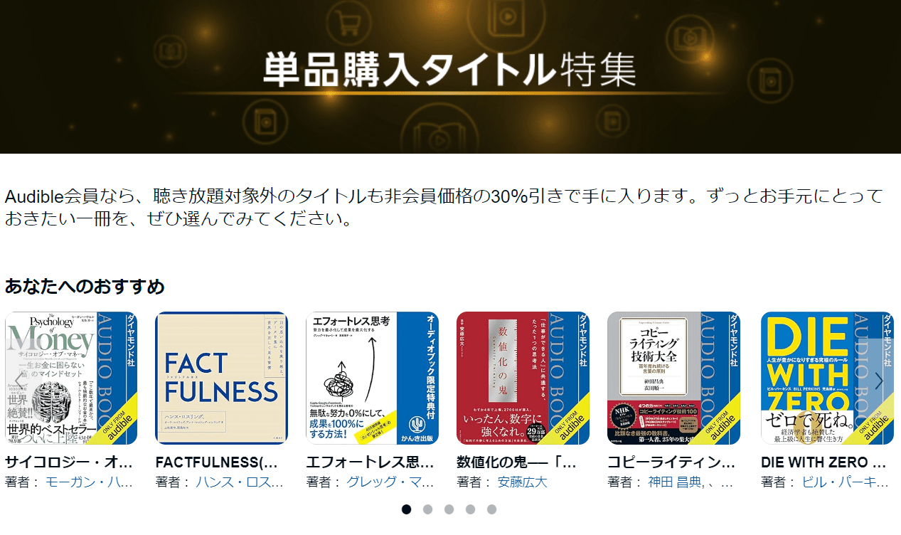 単品購入するにはオーディブル会員にならなくても購入できますが、会員になると30%OFFで購入できます。