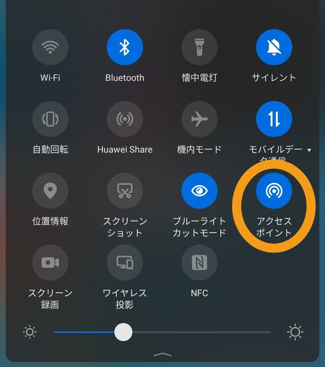 スマホの画面上をスワイプして「アクセスポイント」のマークをタップ。(HUAWEI)
