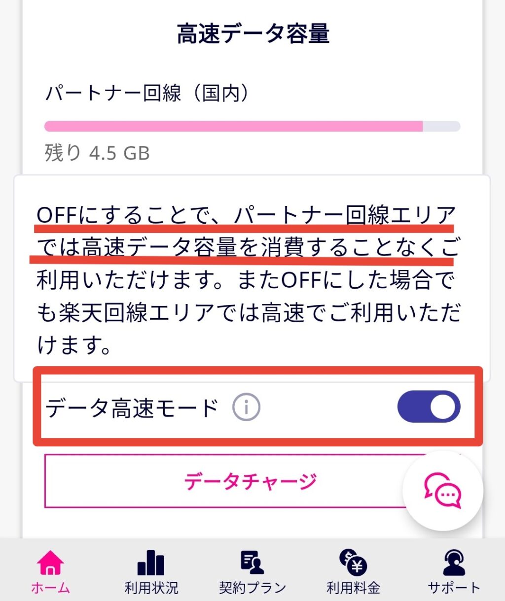 パートナー回線の5GBの高速データを節約するには、アプリ内にある高速モード切り替えスイッチが有効です。