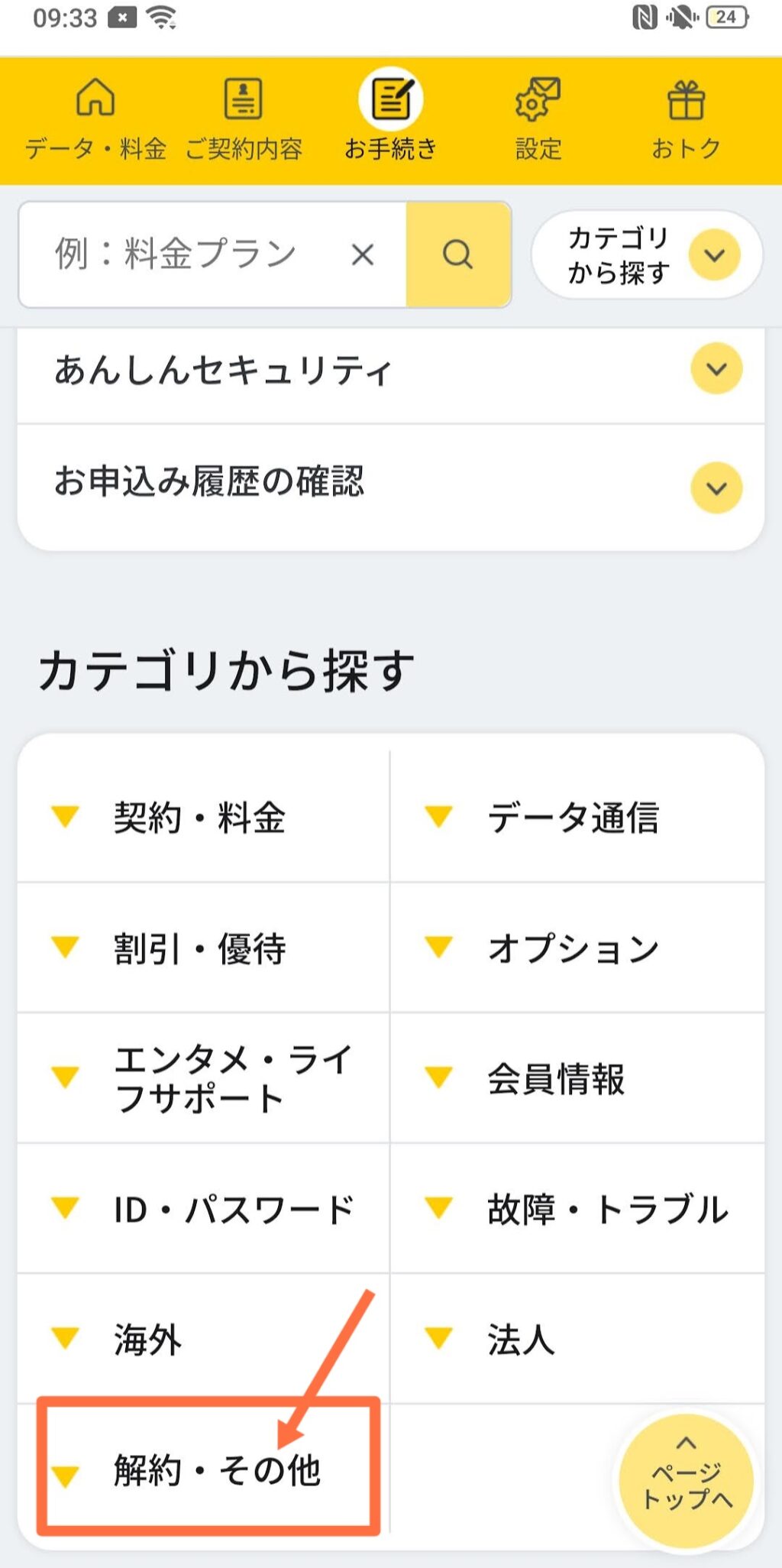 カテゴリの「解約・その他」→SIMロック解除にすすみ、「お手続きする」をタップ。