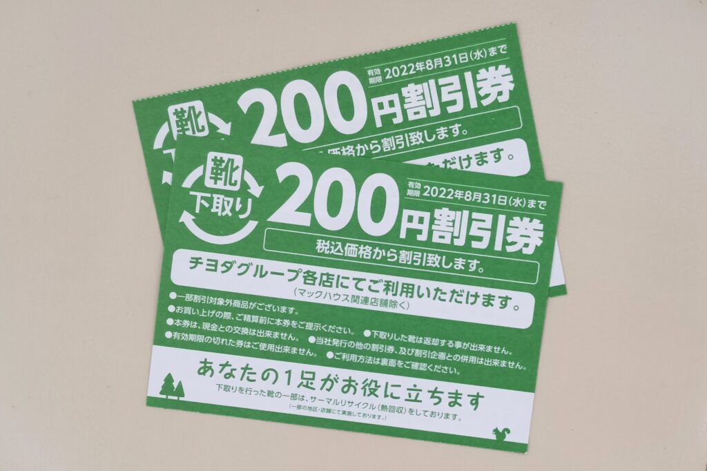チヨダでは、履かなくなった靴を下取りしてくれるサービスがあり、1足につき200円分の割引券がもらえます。