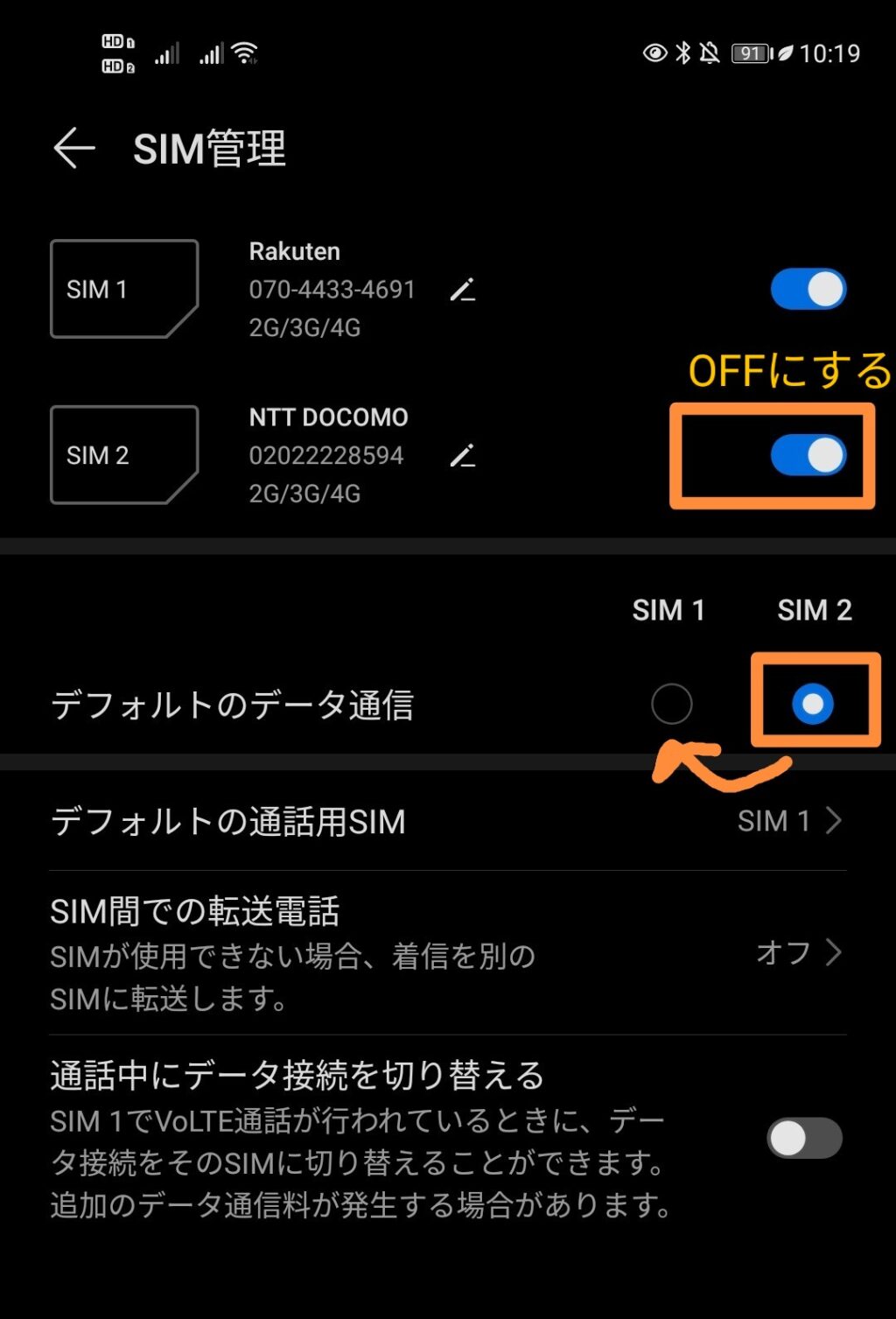 SIM2(ドコモ)の通信をOFFにします。これでドコモのSIMはそのまま入っているものの、通信ができなくなります。