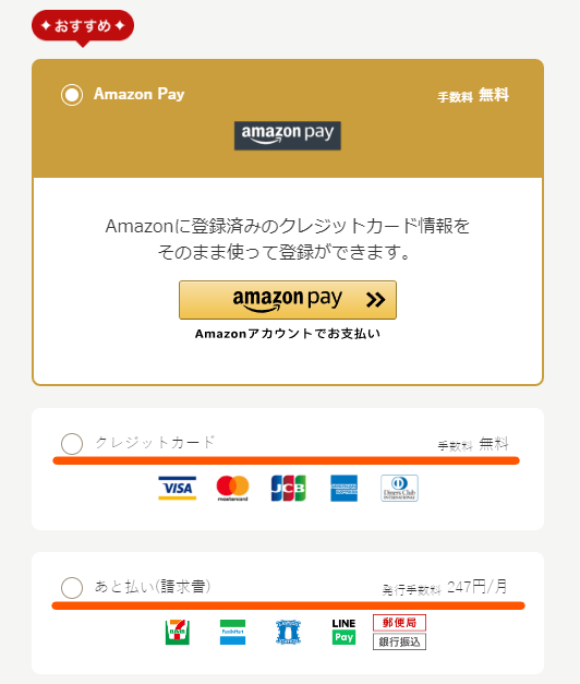 3ヵ月、12ヵ月コースはクレジットカード、AmazonPayのみの支払い方法です。