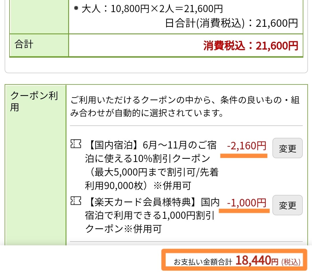 宿泊条件が満たされないと割引クーポンが適用されないので注意してください。