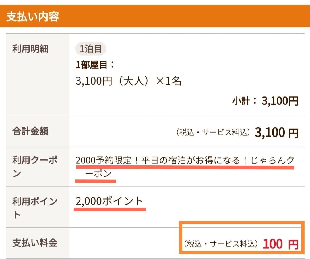 配布されていた1,000円分の宿泊クーポンも併用したので、支払代金は100円になりました。