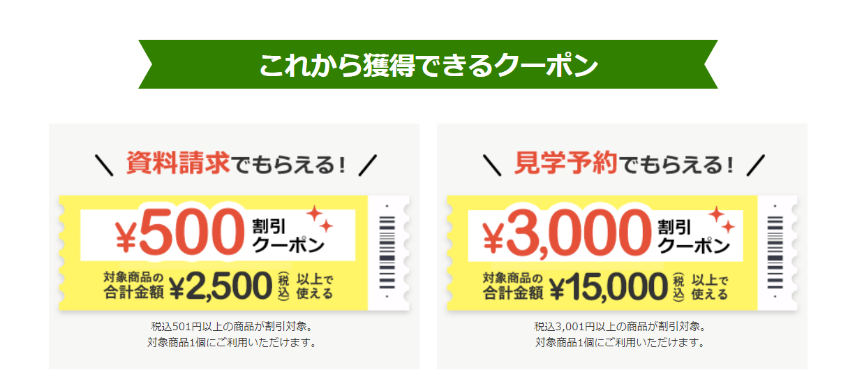 | 利用条件 | 2,500円以上で使える500円分クーポン 15,000円以上で使える3,000円クーポン |
