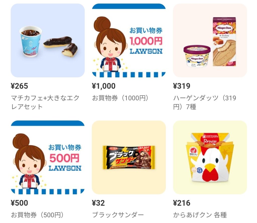 ギフトは、コンビニ商品と交換できる電子チケット、コンビニで使えるお買い物券の2種類があります。